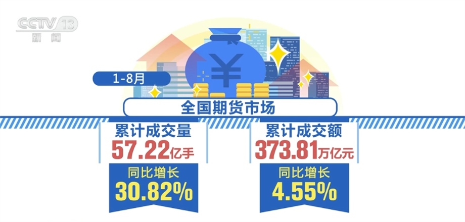 中國期貨業(yè)協(xié)會數(shù)據(jù)顯示,8月全國期貨市場成交量為9.49億手,成交額為60.67萬億元,同比分別增長47.76%和23.49%,環(huán)比分別增長15.38%和18.92%。