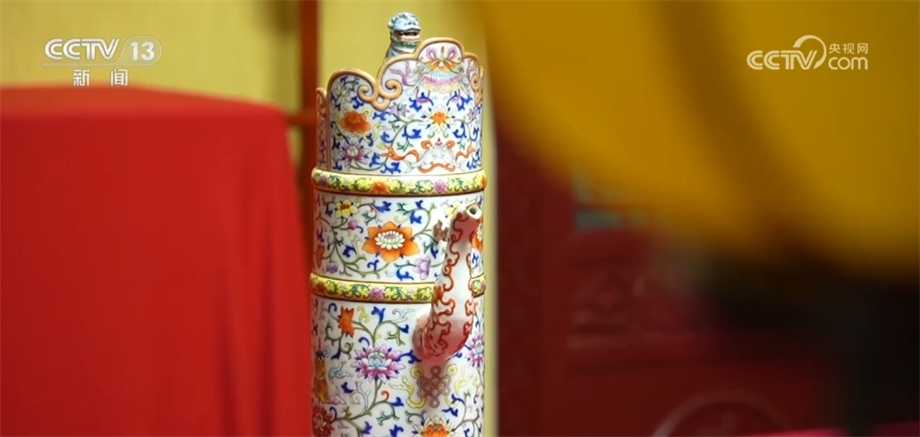 總臺(tái)記者 楊雪:沈陽故宮當(dāng)中的很多珍貴院藏文物都見證了多民族文化融合的過程,像我們眼前看到的這款清乾隆款粉彩多穆壺就是其中之一。多穆在藏語當(dāng)中是奶茶桶的意思,直到現(xiàn)在,像銅制、木制、皮質(zhì)的很多多穆壺仍然被蒙、藏等少數(shù)民族沿襲使用著。大家可以看到,這款多穆壺的蓋子上蹲坐著一只非常靈動(dòng)的小獅子,有祈福和護(hù)佑主人的意思。這件多穆壺是國家一級文物,距今已經(jīng)有200多年的歷史了。