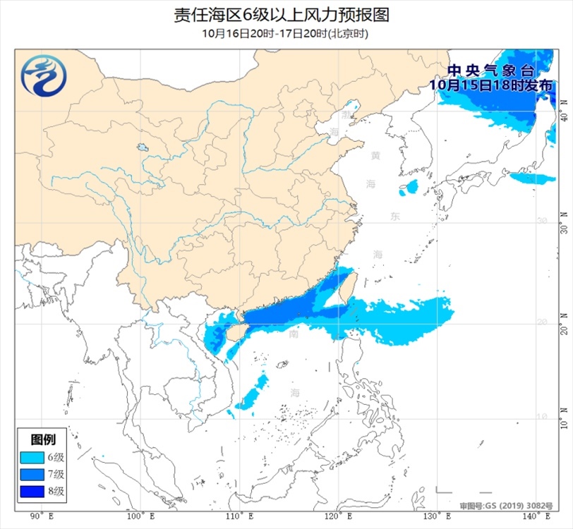 15日夜間至18日白天,臺灣海峽、臺灣以東洋面、巴士海峽、南海北部和中部海域、北部灣、瓊州海峽將有6~7級、陣風(fēng)8~9級的偏北或東北風(fēng)。
