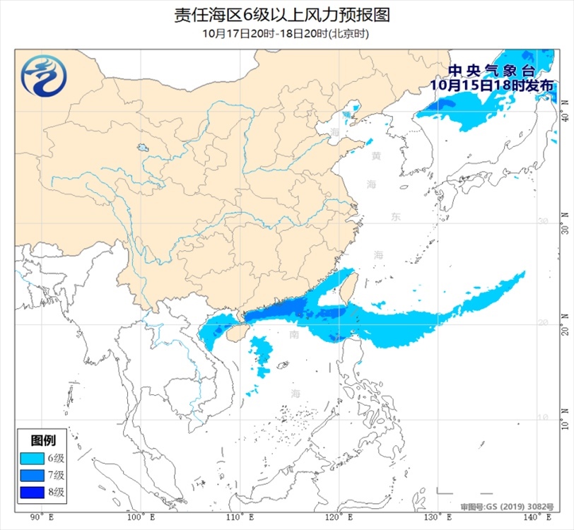 10月18日夜間至22日白天,受冷空氣影響,渤海、渤海海峽、黃海大部海域、東海大部海域、臺灣海峽、巴士海峽、南海北部和中部海域、北部灣、瓊州海峽將有5~7級、陣風(fēng)8級的東北風(fēng)或偏北風(fēng),其中臺灣海峽的部分海域風(fēng)力可達(dá)8級、陣風(fēng)9級。
