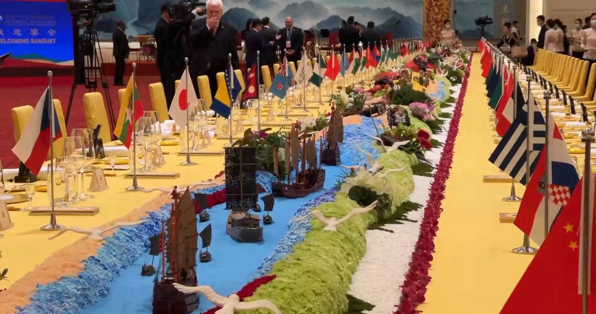 在10月17日晚舉行的歡迎宴會(huì)上,嘉賓們被這樣一個(gè)細(xì)節(jié)深深打動(dòng)——晚宴餐臺(tái)以“撫古觀今、擁抱未來(lái)”為主題,南側(cè)展示著古代絲綢之路的微觀景象:海邊碼頭上擺放著對(duì)外出口的瓷器、絲綢、茶葉等貿(mào)易物資,路上擺放有從西域引進(jìn)的蔬菜瓜果;餐臺(tái)北側(cè)為21世紀(jì)絲綢之路的景觀:以北京天壇的裝飾為起點(diǎn),中間穿插高鐵、中歐班列、新能源汽車(chē)等擺件,展現(xiàn)各國(guó)互聯(lián)互通的景象……