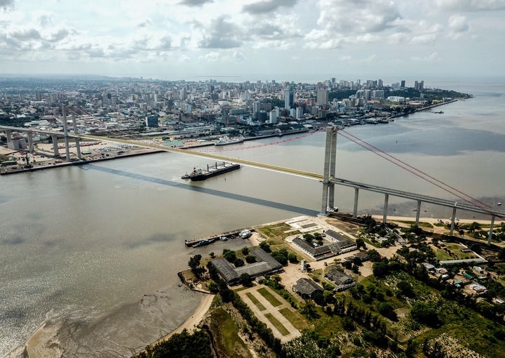 這是2019年4月8日在莫桑比克首都馬普托拍攝的馬普托大橋(無人機(jī)照片)。新華社記者 張宇 攝