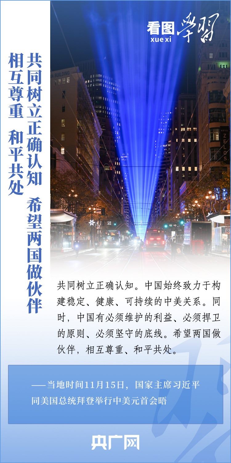 當(dāng)?shù)貢r(shí)間11月15日,國家主席習(xí)近平在美國舊金山斐洛里莊園同美國總統(tǒng)拜登舉行中美元首會晤。兩國元首就事關(guān)中美關(guān)系的戰(zhàn)略性、全局性、方向性問題以及事關(guān)世界和平和發(fā)展的重大問題坦誠深入地交換了意見。習(xí)近平主席指出,大國競爭解決不了中美兩國和世界面臨的問題。這個地球容得下中美兩國。中美各自的成功是彼此的機(jī)遇。一起來學(xué)習(xí)!