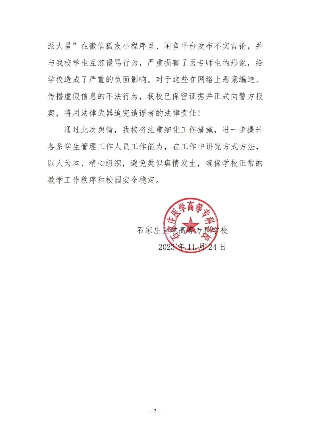 央視網(wǎng)消息:近日,網(wǎng)傳石家莊醫(yī)學(xué)高等專科學(xué)校檢查學(xué)生宿舍,并將沒(méi)收來(lái)的物品掛在二手平臺(tái)咸魚(yú)上出售,事件引發(fā)關(guān)注。11月24日,石家莊醫(yī)學(xué)高等??茖W(xué)校發(fā)布聲明稱,22日學(xué)校利用學(xué)生在宿舍時(shí)間,排查大功率違規(guī)電器。查獲違規(guī)電器分別由各系登記造表、統(tǒng)一保管,定于放寒假時(shí)返還學(xué)生帶回家。經(jīng)核實(shí),網(wǎng)傳短視頻實(shí)為學(xué)生準(zhǔn)備去實(shí)習(xí)一起收拾房間物品時(shí)的視頻,被別有用心人員移花接木、惡意引用。此外,網(wǎng)名為“林北我叫派大星”在微信狐友小程序里、閑魚(yú)平臺(tái)發(fā)布不實(shí)言論,并與學(xué)校學(xué)生互懟謾罵行為,嚴(yán)重?fù)p害了醫(yī)專師生的形象,給學(xué)校造成了嚴(yán)重的負(fù)面影響。學(xué)校已保留證據(jù)并正式向警方報(bào)案。