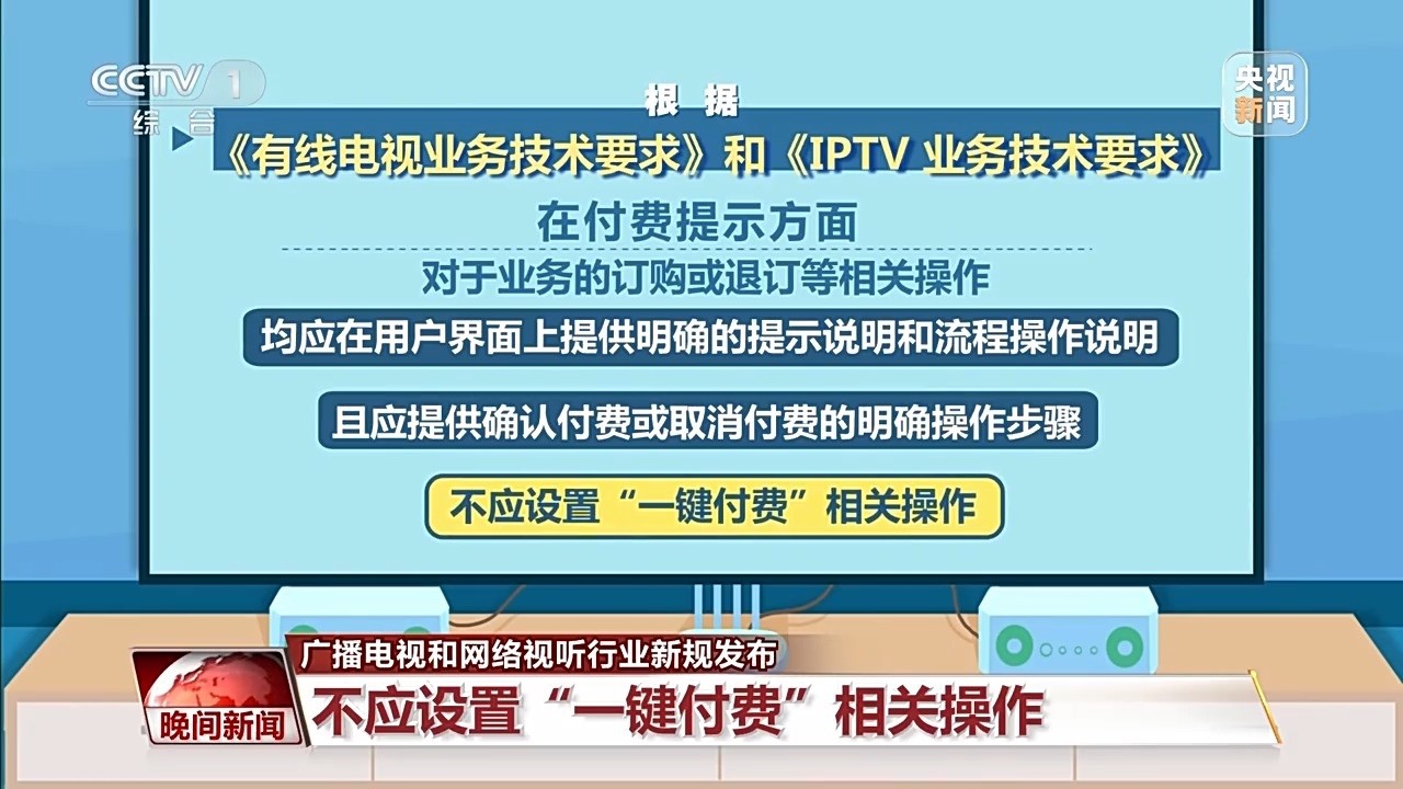 在付費提示方面,對于業(yè)務的訂購或退訂等相關(guān)操作,均應在用戶界面上,提供明確的提示說明和流程操作說明,且應提供確認付費或取消付費的明確操作步驟,不應設(shè)置“一鍵付費”相關(guān)操作。此外,有線電視和IPTV遙控器應具備快捷看直播頻道的按鍵,通過此按鍵直接進入全屏直播,按鍵名稱應為“看電視”。