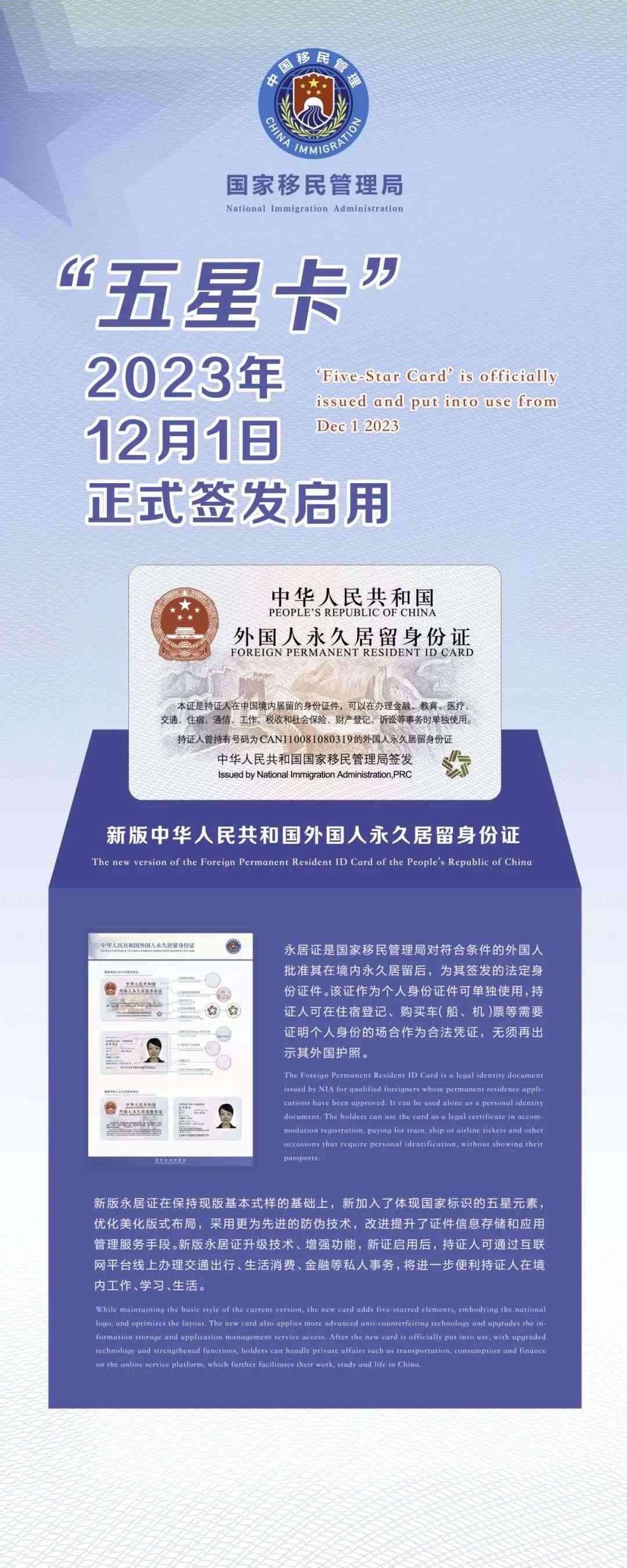 國(guó)家移民管理局相關(guān)負(fù)責(zé)人介紹,“五星卡”由國(guó)家移民管理局簽發(fā),是經(jīng)批準(zhǔn)在中國(guó)境內(nèi)永久居留外國(guó)人的法定身份證件。持證人可在需要證明個(gè)人身份的場(chǎng)合作為個(gè)人身份憑證單獨(dú)使用,無須再出示其外國(guó)護(hù)照。“五星卡”優(yōu)化了證件信息存儲(chǔ)方式,美化了版式布局,采用了更為先進(jìn)的防偽技術(shù),增強(qiáng)了個(gè)人信息保護(hù)和數(shù)據(jù)安全性。國(guó)家移民管理局會(huì)同有關(guān)部門大力推進(jìn)各相關(guān)行業(yè)領(lǐng)域應(yīng)用系統(tǒng)、設(shè)施設(shè)備的適配性升級(jí)改造,便于持證人在交通出行、生活消費(fèi)、金融通信等公共服務(wù)、政務(wù)服務(wù)領(lǐng)域和互聯(lián)網(wǎng)平臺(tái)使用。