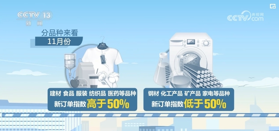 分品種來(lái)看,11月份,建材、食品、服裝、紡織品、醫(yī)藥等品種的新訂單指數(shù)高于50%。鋼材、化工產(chǎn)品、礦產(chǎn)品、家電等品種的新訂單指數(shù)低于50%。