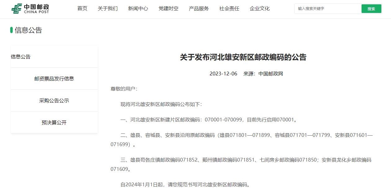 央視網(wǎng)消息:據(jù)中國郵政網(wǎng)消息,中國郵政集團(tuán)有限公司今天發(fā)布河北雄安新區(qū)郵政編碼,以下為公告全文: