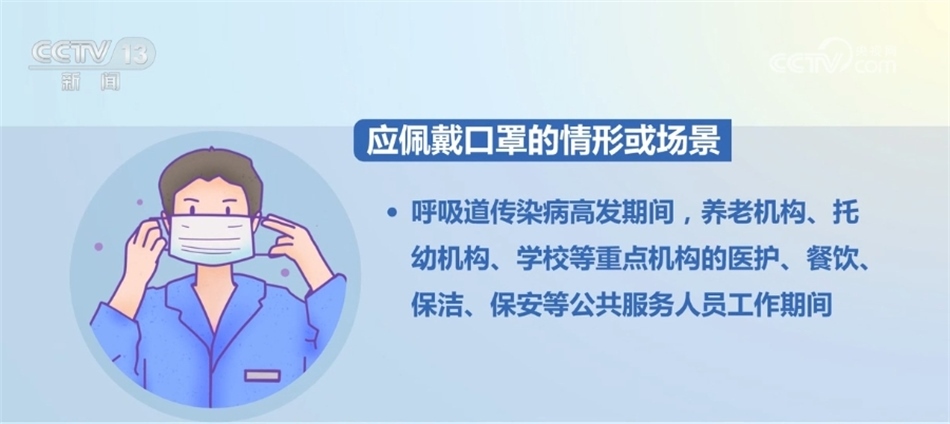 《指引》明確,應(yīng)佩戴口罩的情形或場(chǎng)景包括:新冠病毒感染、流感、肺炎支原體感染、呼吸道合胞病毒感染等呼吸道傳染病感染者前往室內(nèi)公共場(chǎng)所或與他人近距離接觸時(shí)。出現(xiàn)發(fā)熱、咳嗽、流涕、咽痛、肌肉酸痛、乏力等呼吸道傳染病癥狀者前往室內(nèi)公共場(chǎng)所或與他人近距離接觸時(shí)。前往醫(yī)療機(jī)構(gòu)就診、陪診、陪護(hù)、探視時(shí)。呼吸道傳染病高發(fā)期間,外來(lái)人員進(jìn)入養(yǎng)老機(jī)構(gòu)、社會(huì)福利機(jī)構(gòu)、托幼機(jī)構(gòu)等脆弱人群集中場(chǎng)所時(shí)。呼吸道傳染病高發(fā)期間,養(yǎng)老機(jī)構(gòu)、托幼機(jī)構(gòu)、學(xué)校等重點(diǎn)機(jī)構(gòu)的醫(yī)護(hù)、餐飲、保潔、保安等公共服務(wù)人員工作期間。