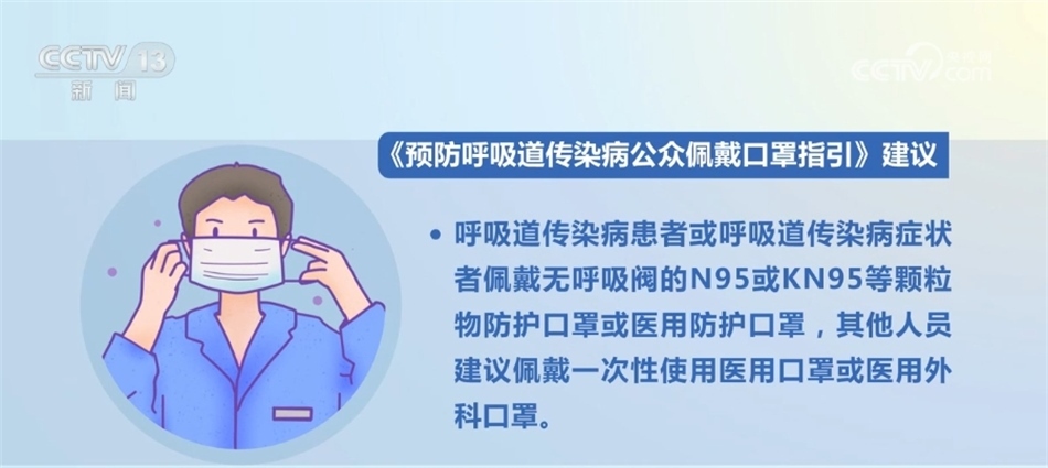 《指引》建議,呼吸道傳染病患者或呼吸道傳染病癥狀者佩戴無(wú)呼吸閥的N95或KN95等顆粒物防護(hù)口罩或醫(yī)用防護(hù)口罩,其他人員建議佩戴一次性使用醫(yī)用口罩或醫(yī)用外科口罩。心肺功能障礙患者應(yīng)在醫(yī)生指導(dǎo)下佩戴口罩。兒童呼吸道傳染病患者或呼吸道傳染病癥狀者建議選用兒童防護(hù)口罩,其他兒童建議選用兒童衛(wèi)生口罩。