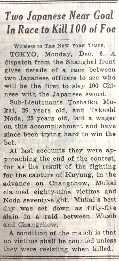 在1937年12月6日發(fā)行的《紐約時報》中,也登載了有關日軍“百人斬”殺人競賽的報道。報道稱,來自上海前線的一份電報詳細介紹了兩名日本軍官之間的一場比賽,看誰先殺死100名中國人。年紀分別為25歲和26歲的日本軍官把賭注壓在了這項“成就”上。