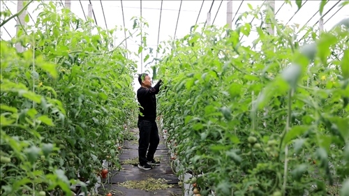 山東省壽光市稻田鎮(zhèn)崔嶺西村村民崔新中在棚內(nèi)查看蔬菜長勢。(壽光市委宣傳部供圖)