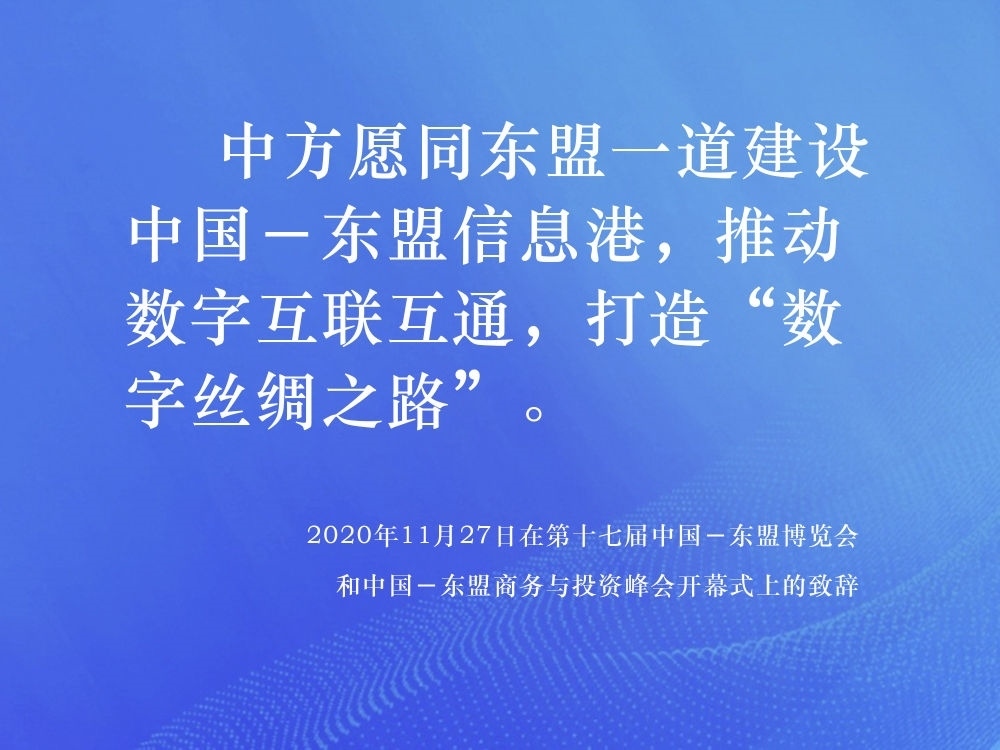 2014年,中國提出與東盟十國共建“中國-東盟信息港”倡議,得到了東盟各國的積極響應(yīng)。在第十七屆中國-東盟博覽會和中國-東盟商務(wù)與投資峰會開幕式上,習近平總書記提出“提升科技創(chuàng)新,深化數(shù)字經(jīng)濟合作”的重要倡議,表示中方愿同東盟各國攜手合作,抓住新一輪科技革命和產(chǎn)業(yè)變革機遇,發(fā)揮互補優(yōu)勢,聚焦合作共贏。