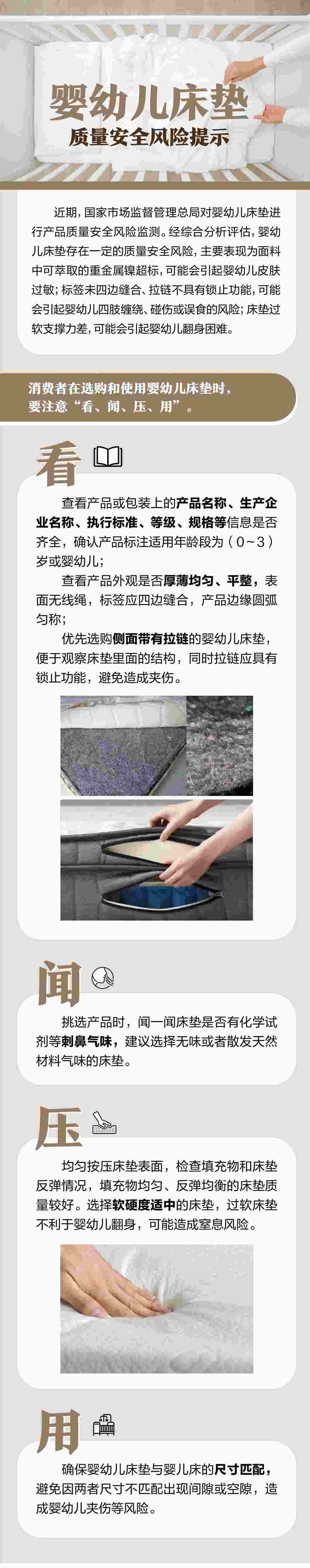 嬰幼兒床墊存在一定的質(zhì)量安全風險,主要表現(xiàn)為面料中可萃取的重金屬鎳超標,可能會引起嬰幼兒皮膚過敏;標簽未四邊縫合、拉鏈不具有鎖止功能,可能會引起嬰幼兒四肢纏繞、碰傷或誤食的風險;床墊過軟支撐力差,可能會引起嬰幼兒翻身困難。