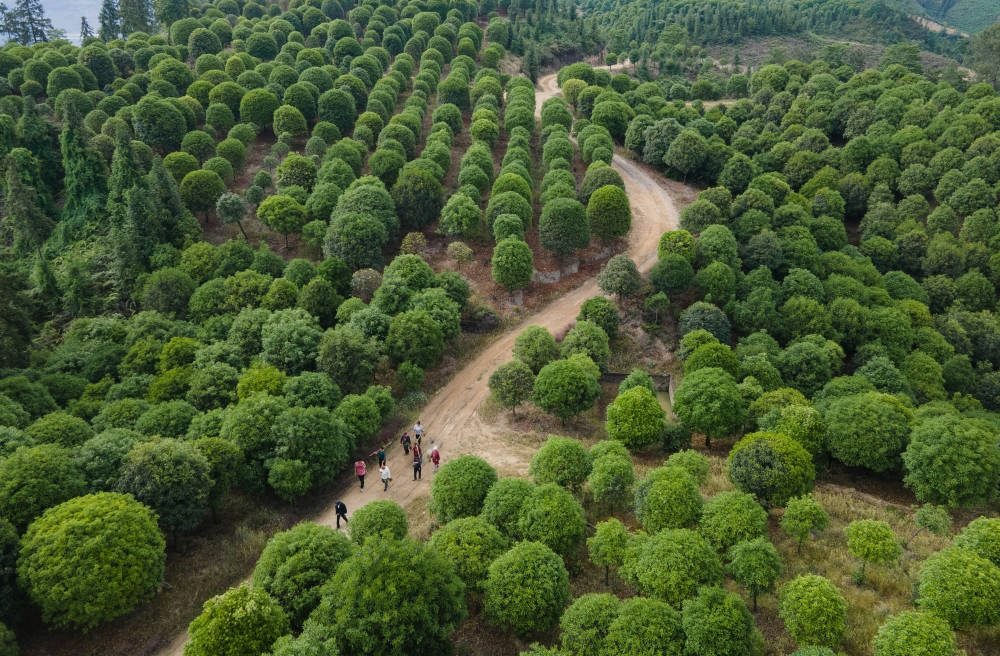 5月14日,李秀雄一家和工人走在四川省榮縣東興鎮(zhèn)長興林場(無人機照片)。25年來,李秀雄一家三代接力植樹造林,讓3000畝荒山變林海。