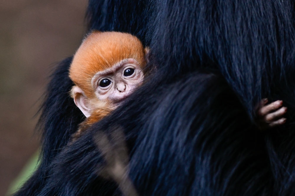 在貴州麻陽河國家級自然保護區(qū)拍攝的黑葉猴幼猴(4月30日攝)。新出生的黑葉猴毛色呈金黃色,幾個月后逐漸變成黑色。