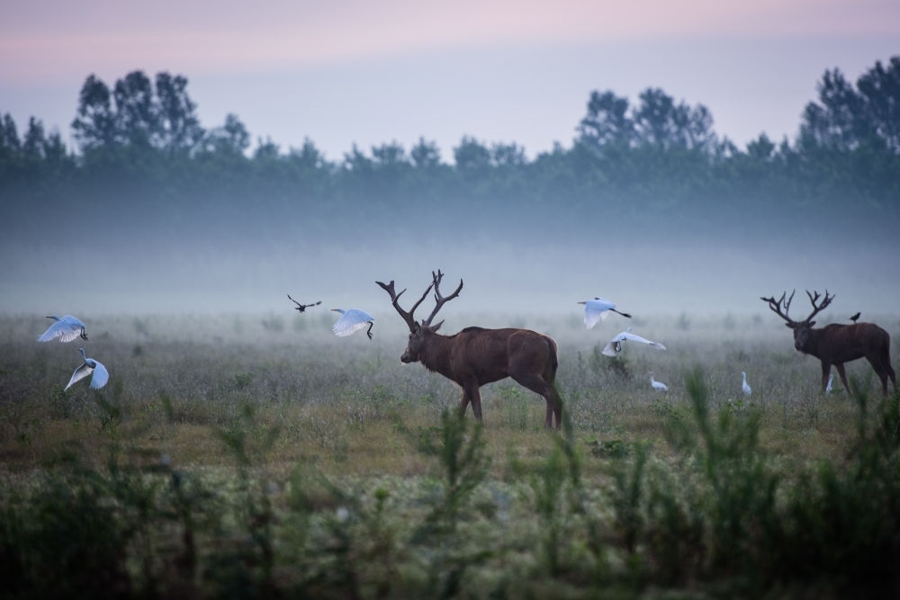 8月1日,兩頭麋鹿在湖北石首麋鹿國家級自然保護區(qū)內(nèi)活動。