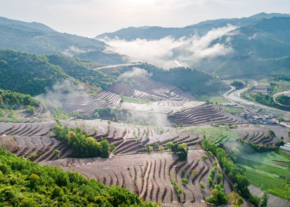陜西省漢中市略陽縣郭鎮(zhèn)譚家莊村綜合治理后的梯田(4月26日攝,無人機照片)。