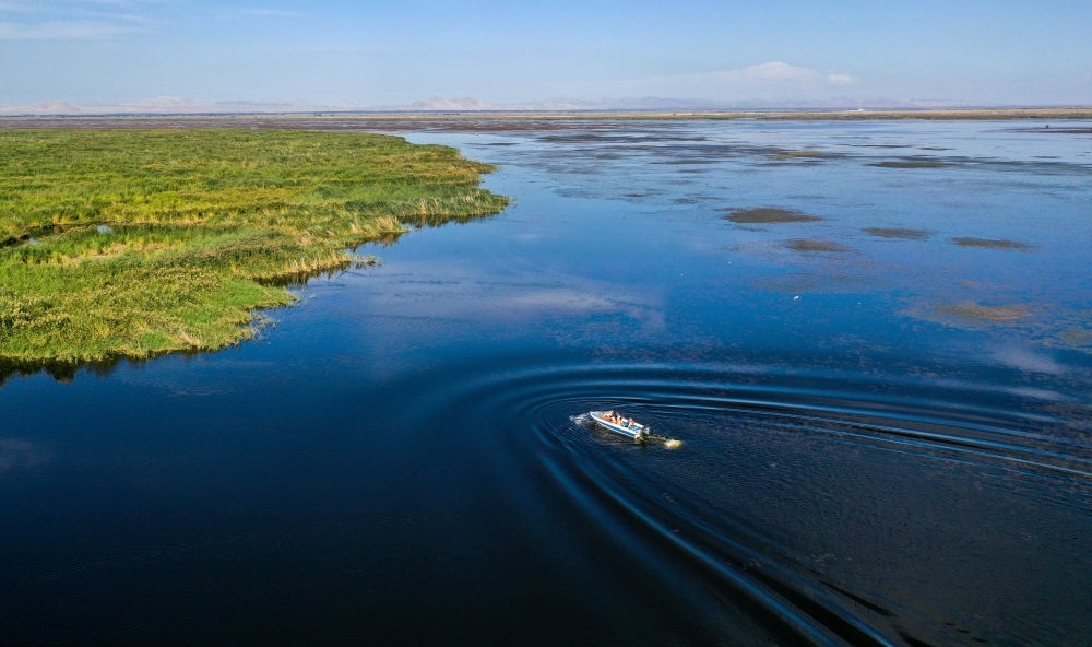9月15日,在內(nèi)蒙古烏梁素海湖面上,河湖濕地水環(huán)境保護與修復(fù)技術(shù)研究團隊成員乘坐快艇去采集湖水樣本(無人機照片)。