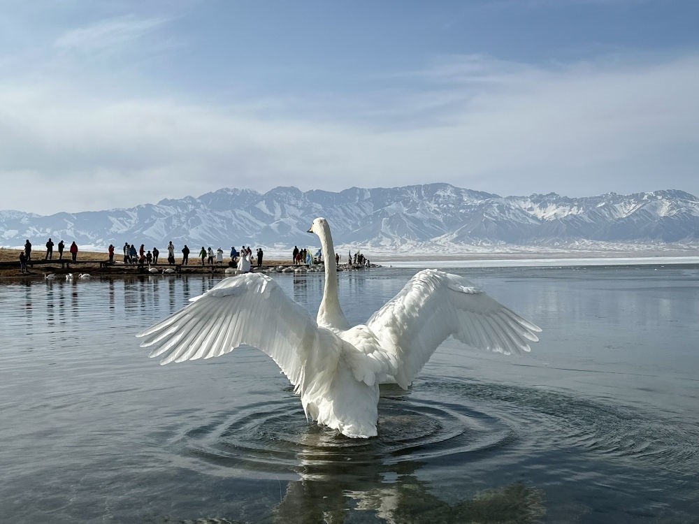 4月6日,游客在新疆博爾塔拉蒙古自治州賽里木湖畔拍照留念。