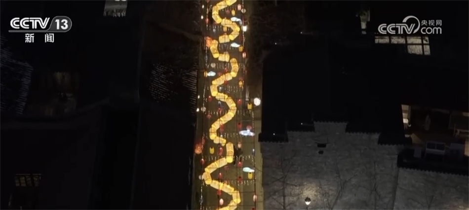 在老門(mén)東景區(qū),從空中俯瞰,一條長(zhǎng)130多米的龍燈貫穿在巷子里,蜿蜒盤(pán)旋點(diǎn)亮了城市夜空。