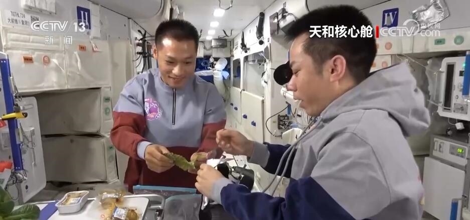 航天員 江新林:我是今天的太空美食家,讓我?guī)ьI(lǐng)大家一起來探索發(fā)現(xiàn)今天的太空美食。我們先看一下主食,熱乎乎的,看看里面都有什么吧,有01最愛吃的白米飯,小心燙哦,02愛吃的面條,我的炒飯。好了,把它粘在餐桌上。然后再讓我們看看我為他們準(zhǔn)備的驚喜??纯催@是什么?這是我們冬至特意結(jié)余的餃子,還有蔬菜副食。地面上的工作人員考慮得特別周到,按照個人的口味為我們準(zhǔn)備了美味的食品,而且將它們塑封包裝,給我們節(jié)余時間的時候又保證它的口味。這是網(wǎng)紅太空香粽,大家印象比較深刻吧,還有這個年糕也是特別好吃、特別美味,還有紅燴豬排,保證有足夠的蛋白質(zhì)攝入量。很豐盛。請看這里,我們特意留了一些新鮮的水果,看看都有什么吧,有美味的蘋果,還有葡萄,大家這個都特別愛吃,我們?nèi)齻€在一起分享一下。