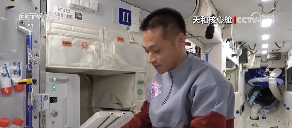 航天員 唐勝杰:你好,我正在對我們的櫻桃番茄進行授粉。因為太空沒有小蜜蜂,我就是那只小蜜蜂。大家看一看,這是我們的太空蔬菜,神十七乘組在“太空出差”期間,我們的太空菜園變得更大了,大家看看我們的蔬菜是不是長勢喜人?今天是新年的第一天,江新林為我們準(zhǔn)備了營養(yǎng)豐盛的太空午餐,但是我覺得今天應(yīng)該再增加一點綠色的、新鮮的蔬菜,午餐就會變得更豐盛了。大家可以看一看,看看我們的櫻桃番茄。誒,拿這兩杯,今天中午我們就吃這兩杯。