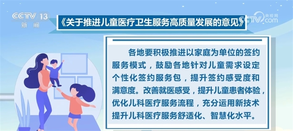 《意見》要求,各地要積極推進(jìn)以家庭為單位的簽約服務(wù)模式,鼓勵(lì)各地針對(duì)兒童需求設(shè)定個(gè)性化簽約服務(wù)包,提升簽約感受度和滿意度。改善就醫(yī)感受,提升兒童患者體驗(yàn),優(yōu)化兒科醫(yī)療服務(wù)流程,充分運(yùn)用新技術(shù)提升兒科醫(yī)療服務(wù)舒適化、智慧化水平。