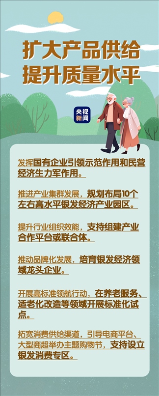 在民生事業(yè)方面,國(guó)家將擴(kuò)大和發(fā)展七方面的服務(wù),包括養(yǎng)老助餐、居家助老、社區(qū)便民、老年健康、養(yǎng)老照護(hù)、老年文體、農(nóng)村養(yǎng)老等方面的服務(wù)。國(guó)務(wù)院辦公廳印發(fā)《關(guān)于發(fā)展銀發(fā)經(jīng)濟(jì)增進(jìn)老年人福祉的意見》中提出了4個(gè)方面舉措,小編根據(jù)文件內(nèi)容進(jìn)行了簡(jiǎn)要梳理,一圖了解“銀發(fā)經(jīng)濟(jì)”核心要點(diǎn)。↓↓↓