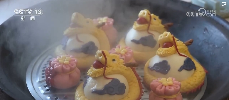 在黑龍江樺南縣,為了圖個熱鬧、沾個喜氣,誰家蒸花饃,鄉(xiāng)里鄉(xiāng)親都會前來幫忙。在村民張瑞雪家里,大家圍坐在桌前,小小面團通過“一印、二捏、三鑲”等技法,再起鍋開蒸,就變成了精美的龍年花饃。這些花饃形態(tài)各異,有的威武雄壯、有的憨態(tài)可掬,不僅外觀吸引人,更承載著美好的新年祝福。