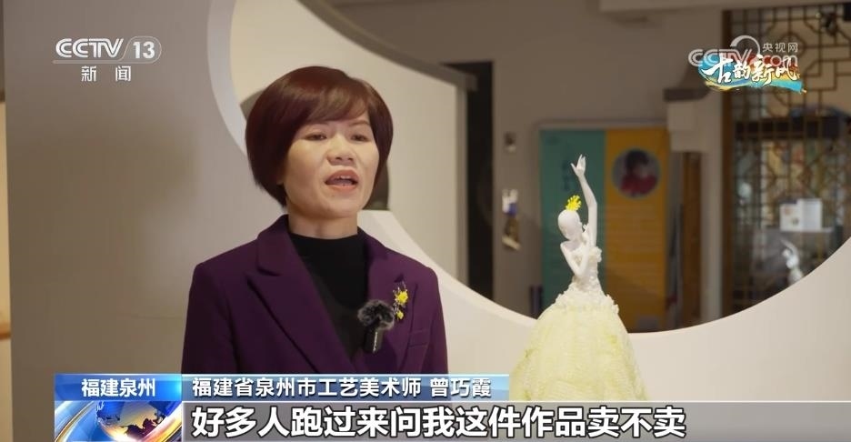 福建省泉州市工藝美術(shù)師 曾巧霞:這件作品是以芭蕾舞的形式去表現(xiàn)的,然后結(jié)合我們德化這種薄胎和手捏花的工藝來表現(xiàn)整件作品。我把這件作品帶到國(guó)博去展出,好多人跑過來問我賣不賣,現(xiàn)在不是沒人要,是訂單多到已經(jīng)做不出來的問題了。