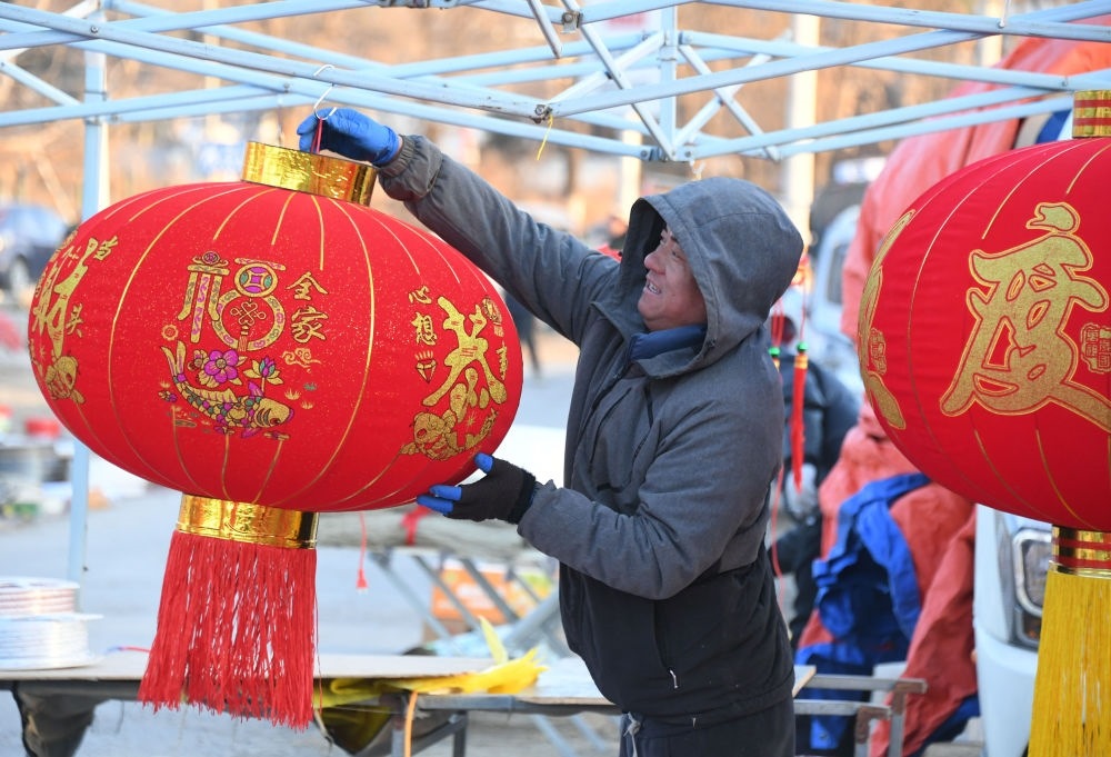 2024年1月27日,在北京市平谷區(qū)金海湖鎮(zhèn)靠山集大集,商戶在布置攤位。新華社記者 任超 攝