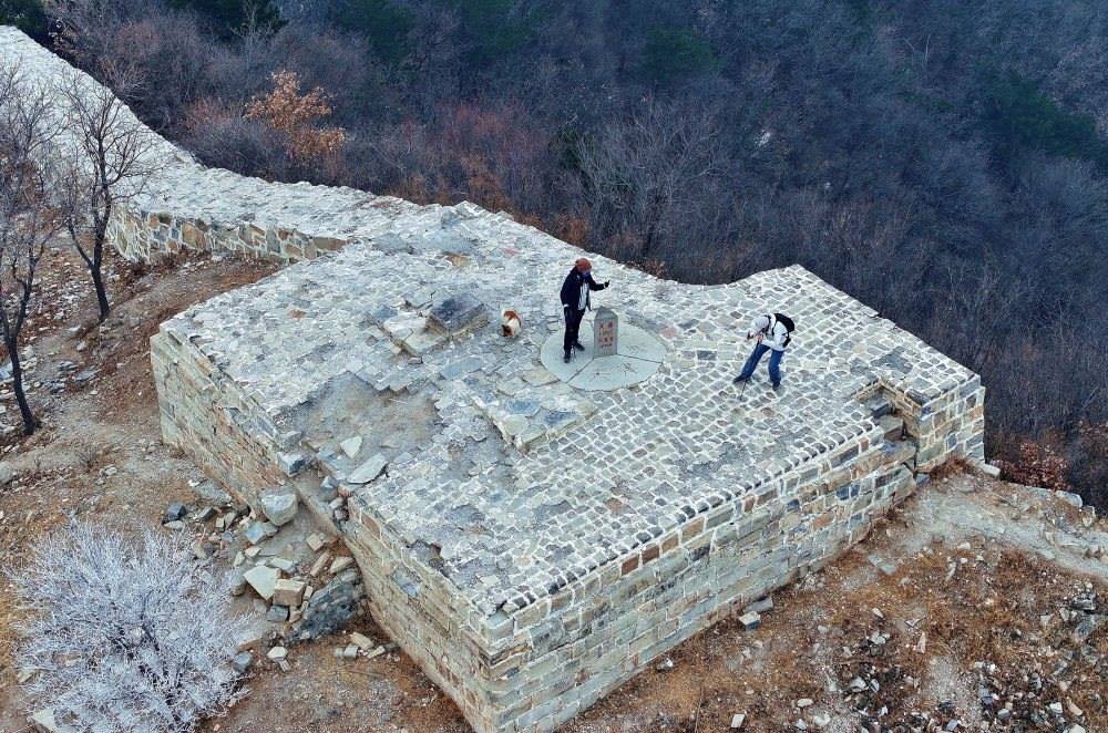 這是位于北京平谷、天津薊州、河北承德交界處的三界碑,以長城和山脊為界劃分出北京、天津和河北三地(2024年1月30日攝,無人機照片)。新華社記者 趙子碩 攝