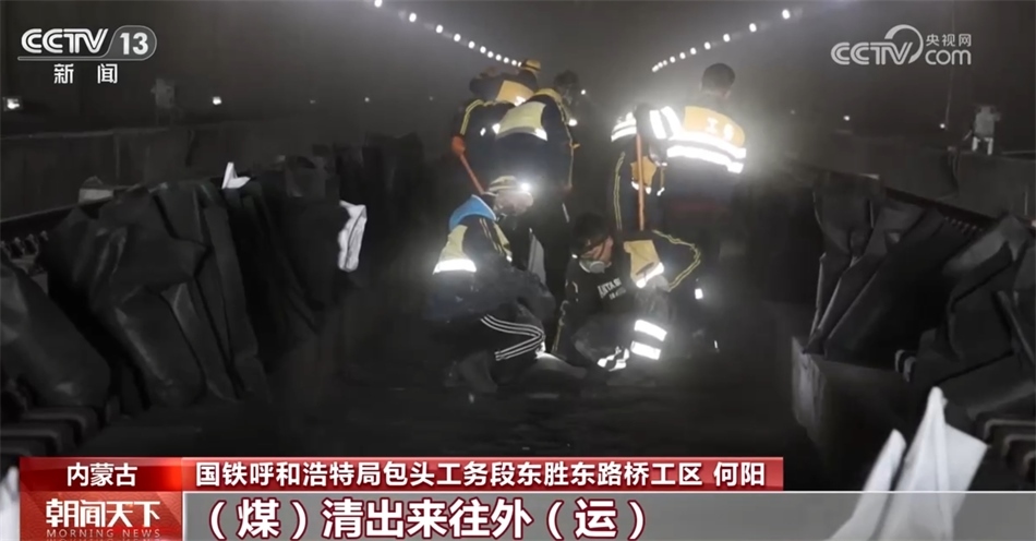國(guó)鐵呼和浩特局包頭工務(wù)段東勝東路橋工區(qū) 何陽(yáng):這塊就已經(jīng)(堆)積得相當(dāng)厚了,咱們今天必須抓緊時(shí)間把這個(gè)清出來(lái),煤清出來(lái)往外運(yùn),要不然后面影響貨車正常通行。