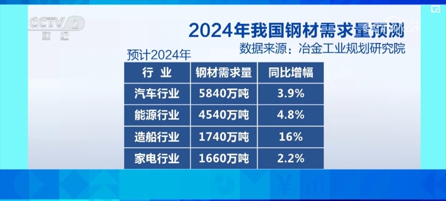根據(jù)冶金工業(yè)規(guī)劃研究院的綜合預測,2024年,我國鋼材需求量為8.75億噸。從下游行業(yè)消費來看,預計2024年,汽車行業(yè)的鋼材需求為5840萬噸,同比增長3.9%;能源行業(yè)的鋼材需求為4540萬噸,同比增長4.8%;造船行業(yè)的鋼材需求為1740萬噸,同比增長16%;家電行業(yè)的鋼材需求為1660萬噸,同比增長2.2%。
