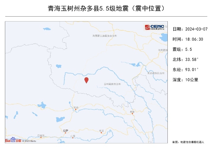 央視網(wǎng)消息:中國(guó)地震臺(tái)網(wǎng)正式測(cè)定:03月07日18時(shí)06分在青海玉樹州雜多縣(北緯33.58度,東經(jīng)93.01度)發(fā)生5.5級(jí)地震,震源深度10千米。據(jù)地震人口熱力圖數(shù)據(jù),震中周邊屬于高原無人區(qū),目前也暫未收到震感反饋。此次震中距離最近的西藏聶榮縣城177公里、距青海雜多縣城227公里,震中5公里范圍內(nèi)平均海拔約4809米。
