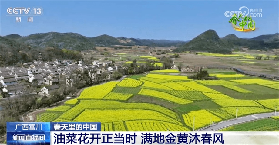 現(xiàn)在我們看到的是廣西富川瑤族自治縣的四萬(wàn)多畝油菜。眼下,春意正濃,油菜進(jìn)入盛花期,明艷的金黃色成了春日主色調(diào)。油菜花次第開(kāi)放,清風(fēng)微拂,淡淡花香沁人心脾,花海與山巒、古村勾勒出一幅田園春景圖,吸引不少游客前來(lái)賞花踏青,感受春天的氣息。