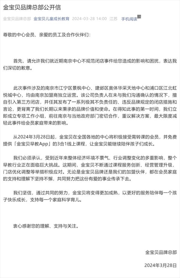 ·連鎖早教機構(gòu)金寶貝多地門店停業(yè),家長遭遇退款難,金寶貝總部回應(yīng)致歉。