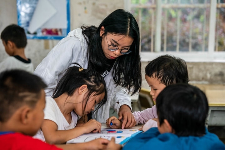 ?在云南省文山州文山市馬塘鎮(zhèn)新開田村委會新開田一隊,志愿者楊紅非在“少年兒童之家”教孩子們繪畫(2022年8月9日攝)。