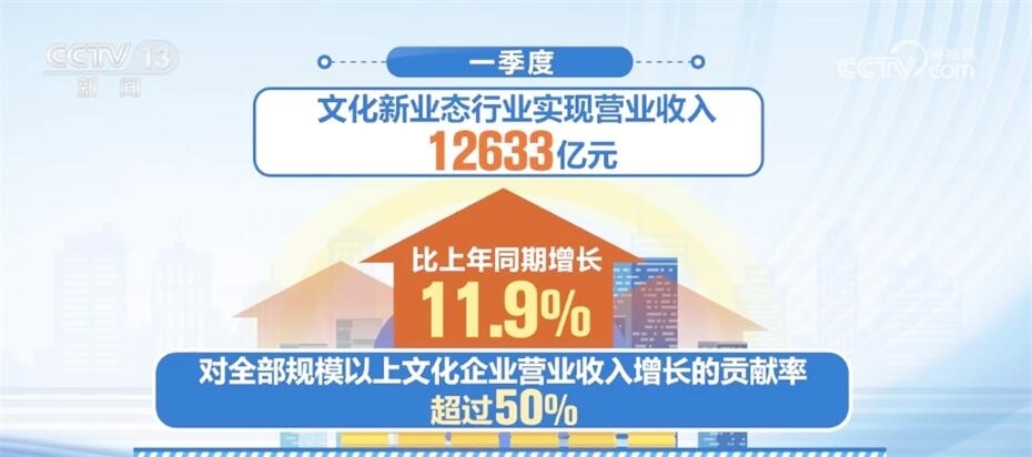 文化新業(yè)態(tài)行業(yè)持續(xù)發(fā)揮帶動(dòng)效應(yīng),一季度,文化新業(yè)態(tài)行業(yè)實(shí)現(xiàn)營業(yè)收入12633億元,比上年同期增長11.9%,對(duì)全部規(guī)模以上文化企業(yè)營業(yè)收入增長的貢獻(xiàn)率超過50%。