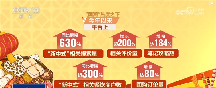 “國潮”熱度之下,2024年以來,平臺上“新中式”相關(guān)搜索量同比增幅也達到了630%,相關(guān)評價量增長超200%,筆記攻略數(shù)增幅達184%?!靶轮惺健毕嚓P(guān)餐飲商戶數(shù)同比增幅近300%,團購訂單量增幅達80%。