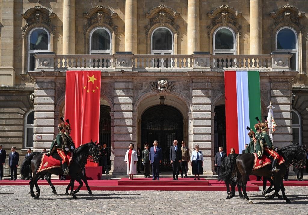 初夏時(shí)節(jié)的布達(dá)佩斯陽光明媚,古老宏偉的布達(dá)王宮莊嚴(yán)矗立,中匈兩國國旗相映成輝。習(xí)近平和夫人彭麗媛乘坐的國賓車隊(duì)在匈牙利禮賓馬隊(duì)護(hù)衛(wèi)下緩緩駛?cè)氩歼_(dá)王宮內(nèi)庭。舒尤克總統(tǒng)夫婦和歐爾班總理夫婦熱情迎接。