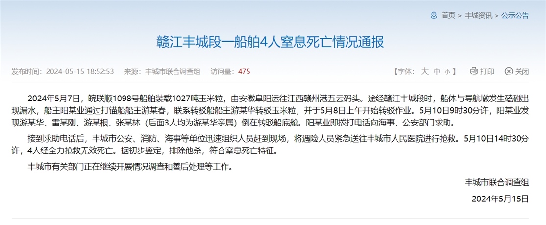 ·江西豐城4人轉(zhuǎn)運受潮玉米時身亡,官方通報:因窒息死亡,排除他殺。