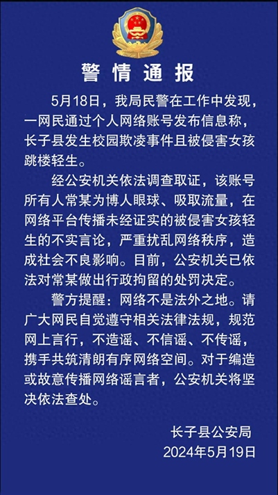 ·為流量造謠女生受欺凌輕生網(wǎng)民被行拘,警方通報:相關(guān)涉事人員被處罰,造謠女生輕生者被行拘。