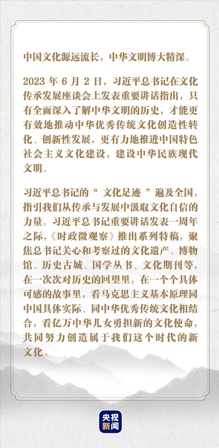 “這段時(shí)間,我一直在思考推進(jìn)中國(guó)特色社會(huì)主義文化建設(shè)、建設(shè)中華民族現(xiàn)代文明這個(gè)重大問題?!?023年6月2日,在文化傳承發(fā)展座談會(huì)上,習(xí)近平總書記指出,“只有全面深入了解中華文明的歷史,才能更有效地推動(dòng)中華優(yōu)秀傳統(tǒng)文化創(chuàng)造性轉(zhuǎn)化、創(chuàng)新性發(fā)展,更有力地推進(jìn)中國(guó)特色社會(huì)主義文化建設(shè),建設(shè)中華民族現(xiàn)代文明?!?/p>