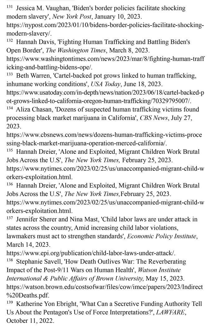 邊境政策助長現(xiàn)代奴隸制。美國政府的邊境政策加劇人口販運問題。被遺棄在邊境州城鎮(zhèn)或被運往全國各地的移民,往往處于孤立無援境地,最容易受到剝削和販運。那些非法越境后聚集在擁擠、缺乏監(jiān)管的庇護(hù)所的兒童也成為人口販子的獵物。(注131)在美國被販運的人中,72%是移民,其中大部分是通過偷渡入境,人口販運的受害者多是婦女和兒童。打擊販賣婦女聯(lián)盟的一項研究估計,60%的越境無人陪伴移民兒童被犯罪集團(tuán)強(qiáng)迫從事兒童色情甚至販毒活動。(注132)《今日美國報》網(wǎng)站2023年6月18日報道,移民被販毒集團(tuán)誘騙到加利福尼亞州北部和俄勒岡州南部的農(nóng)場從事大麻種植,遭受奴役和強(qiáng)迫勞動。被販賣的移民在大麻農(nóng)場遭持槍恐嚇,每天被迫工作16個小時甚至更長時間,有時連飯都吃不上。移民婦女遭到性侵犯,有些人被謀殺,尸體被丟棄在荒野中。(注133)美國哥倫比亞廣播公司新聞網(wǎng)2023年7月27日報道,近60名遭人口販運的受害者被偷運到加利福尼亞中部的一個非法大麻種植場所,被強(qiáng)迫加工大麻,向偷運者償還債務(wù)。(注134)