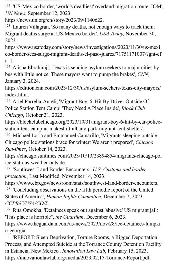 入境移民遭受酷刑及其他不人道待遇。2023財年,在美國南部邊境遭逮捕或驅(qū)逐的移民總數(shù)達(dá)240多萬人,再創(chuàng)歷史新高。(注127)聯(lián)合國人權(quán)事務(wù)委員會對移民在美國受到長時間的拘留表示擔(dān)憂,批評美國的拘留所條件惡劣,人滿為患,被拘押者無法獲得食物、水和醫(yī)療服務(wù),導(dǎo)致包括兒童在內(nèi)的許多人死亡;公共和私營移民拘留設(shè)施存在性暴力、長期單獨監(jiān)禁、虐待等侵犯人權(quán)問題。(注128)英國《衛(wèi)報》網(wǎng)站2023年12月6日報道,由美國私人監(jiān)獄公司CoreCivic運營的、位于佐治亞州蘭普金的斯圖爾特拘留中心存在長期單獨監(jiān)禁、性虐待、醫(yī)療疏忽以及強(qiáng)迫勞動等令人擔(dān)憂的問題。(注129)創(chuàng)新法律實驗室于2023年2月15日發(fā)布報告揭露,由CoreCivic運營的、位于新墨西哥州埃斯坦西亞的托蘭斯縣拘留所存在對被關(guān)押者實施酷刑現(xiàn)象。在夜間,每隔15分鐘就會有一名警衛(wèi)開著收音機(jī)的最大音量走過這些房間,大聲地敲著門,并用手電筒強(qiáng)光照進(jìn)房間,吵醒任何可能睡著的人。在寒冷的天氣里,每個房間的通風(fēng)管道整夜都在吹冷空氣。一些人試圖用衛(wèi)生紙或毯子蓋住通風(fēng)口,但警衛(wèi)們拿走了用來阻擋冷空氣的任何東西。這些牢房里,廁所污水和糞便溢出,人們被迫睡在臭氣熏天的地板上。(注130)