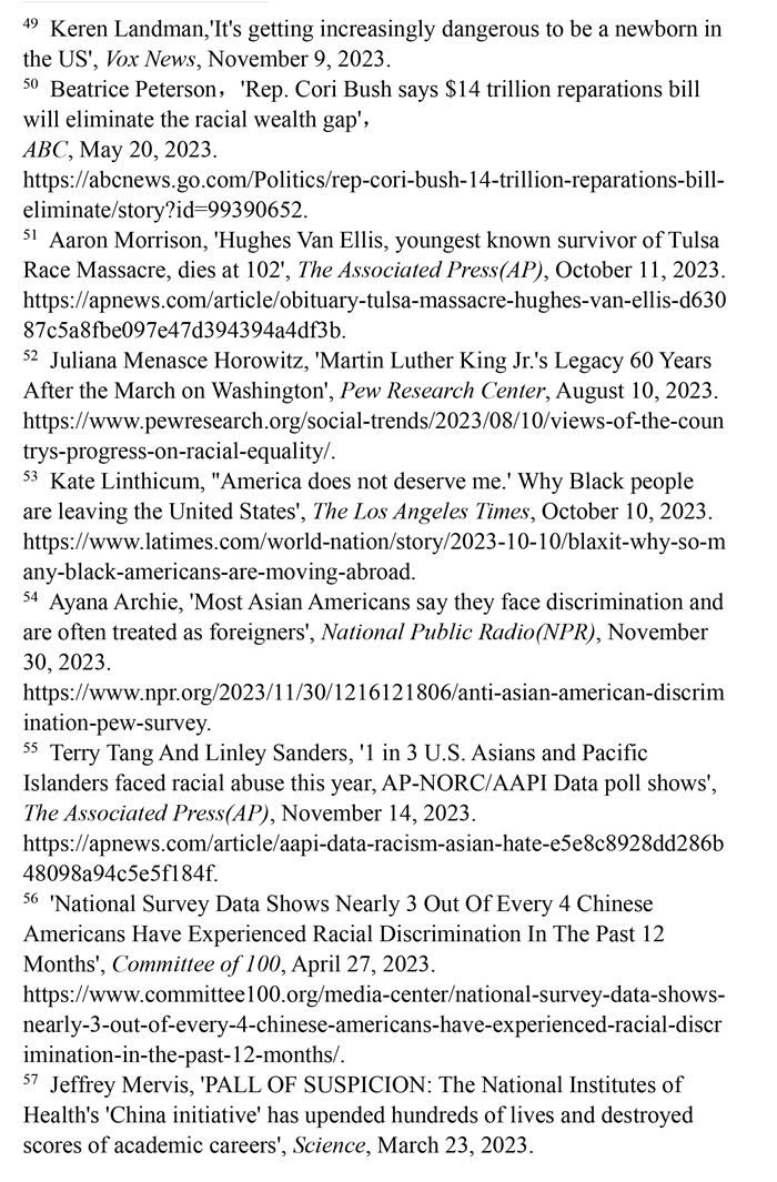 對華裔科學(xué)家的迫害仍在持續(xù)。雖然美國政府針對華裔科學(xué)家的“中國行動計劃”被暫停,但該計劃帶來的深遠(yuǎn)影響?yīng)q在,眾多華裔科學(xué)家仍然有強(qiáng)烈的不安全感。美國《科學(xué)》雜志2023年3月23日刊發(fā)文章,講述了“中國行動計劃”對華裔科學(xué)家的迫害。在被美國國立衛(wèi)生研究院調(diào)查的246人中,103人失去工作,超過五分之一的人被禁止在4年內(nèi)申請國立衛(wèi)生研究院資助,給他們的學(xué)術(shù)生涯帶來重大打擊。這246人中有81%的科學(xué)家是亞裔。(注57)普林斯頓大學(xué)、哈佛大學(xué)和麻省理工學(xué)院對近1400名在美國大學(xué)擔(dān)任終身教職的華裔美國人的調(diào)查顯示,72%的人表示沒有安全感,42%的人害怕在美國開展研究。(注58)