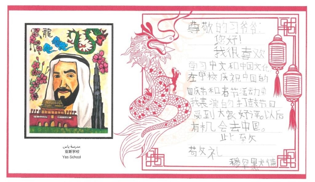 在5年級學(xué)生穆罕默德的畫筆下,北京天安門和迪拜哈利法塔并排而立,四周鮮花盛開。這個多才多藝的男孩在信中告訴習(xí)爺爺,自己很喜歡學(xué)中文和中國文化,學(xué)校組織了春節(jié)、中國國慶等活動,他表演的打鼓受到好評。他期待“以后有機會去中國”。