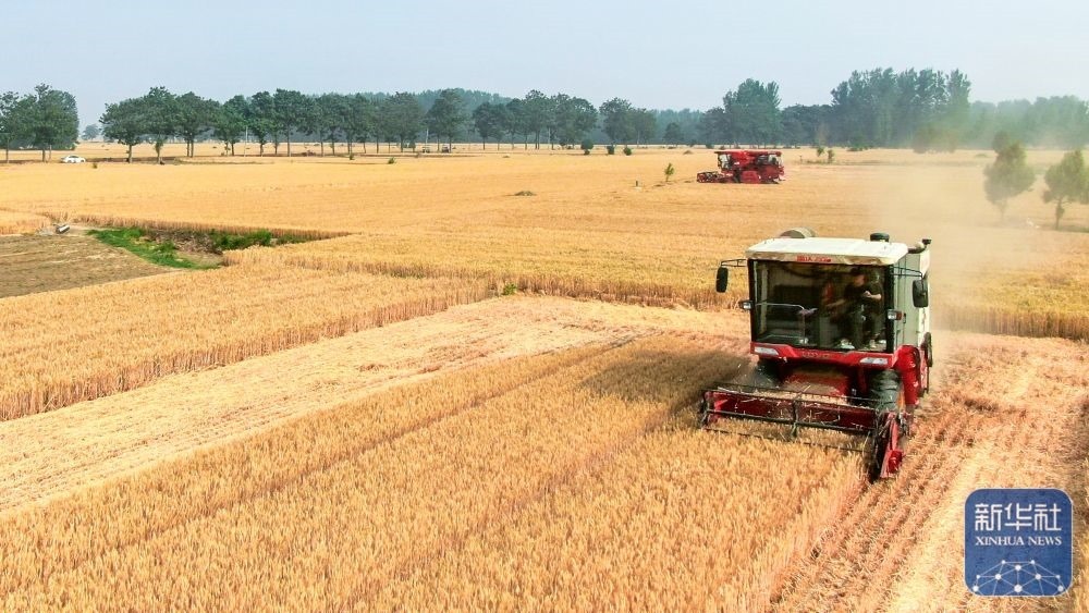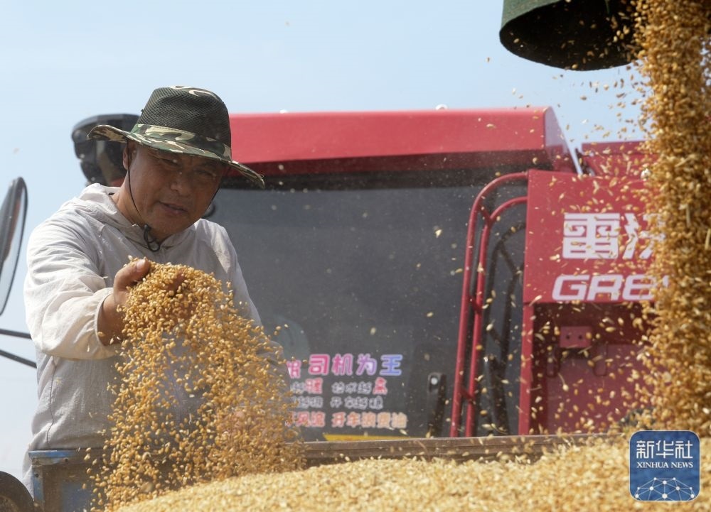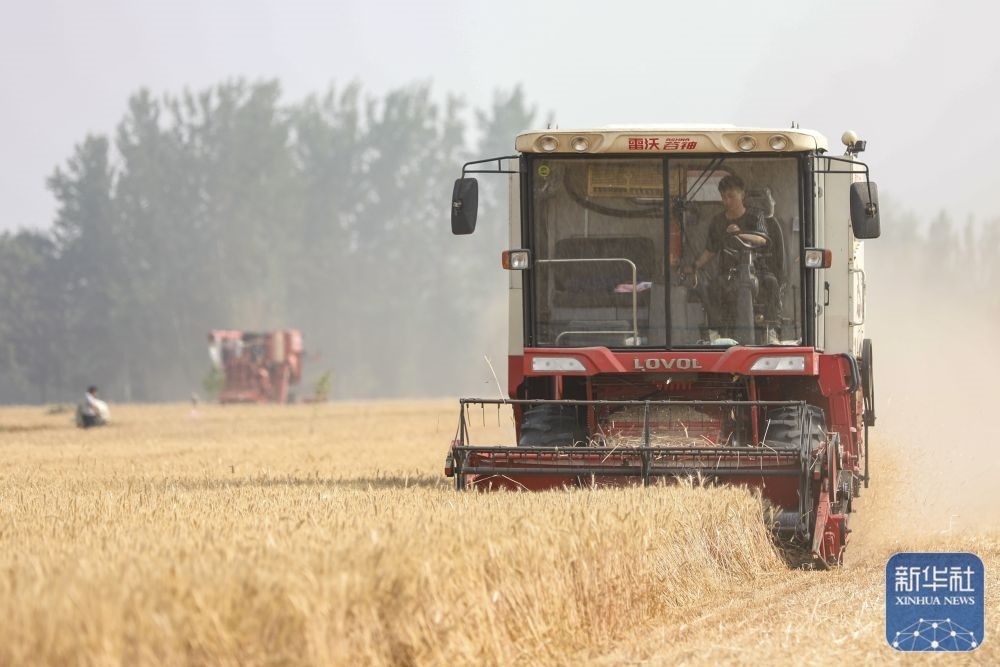 5月26日,在河南省商丘市睢縣尚屯鎮(zhèn)荒莊村,農(nóng)民駕駛收割機搶收小麥。新華社發(fā)(徐澤源攝)